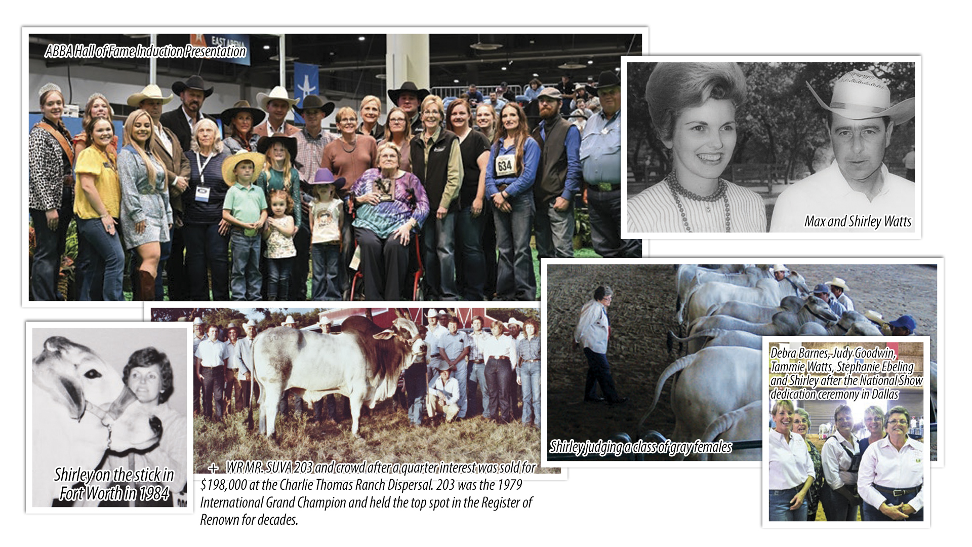 The Tic Tac Toe and Watts Ranches have produced cattle that have influenced great herds around the world. The Watts have produced and raised influential Brahman herd sires including eight Register of Renown bulls and a Maternal Performance sire – (+)WR MR. SUVA 203, +TTT MR. RAMBO 118, +TTT MR. SUVA CRATA 163 , +TTT-SS SIDNEY 245, +TTT MR. SUVA CRATA 450 , +TTT MR. TEXAS LOTTO 670, +TTT SUVA BOB MANSO 786, +TTT MR. MAYRO SUVA 845 and (=)TTT MR S SUVA 1ST 886 and 34 Register of Renown cows. The same keen eye that has made her an outstanding breeder also helped Shirley to become an internationally renowned judge. Shirley started judging steers and heifers at county fairs in 1976. Over the years, she judged in five countries and nine states. Perhaps most notably, she was the first woman to judge the International Brahman Show at the Houston Livestock Show and rodeo in 1998. In 2003, Max and Shirley were honored at both Dallas and Fort Worth for having exhibited cattle for 55 consecutive years.
